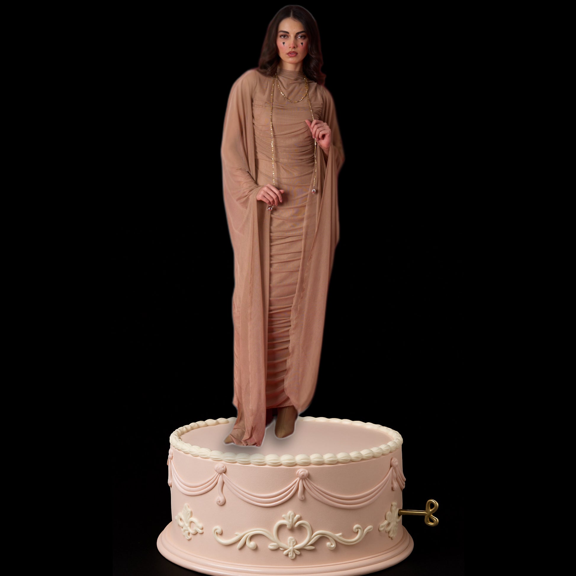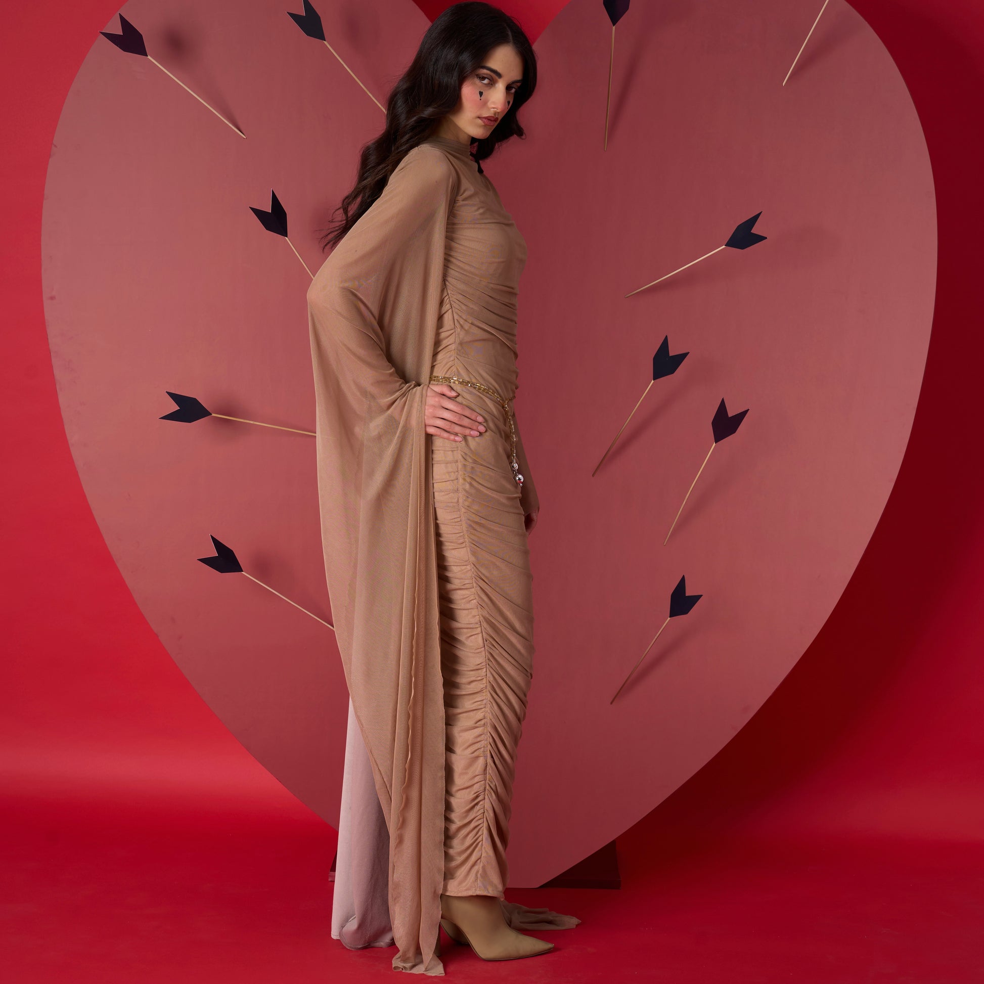 A ruched gown with sheer draped sleeves, a detachable velvet tail, and multiwear bead detailing. Designed to sculpt, flow, and transform.