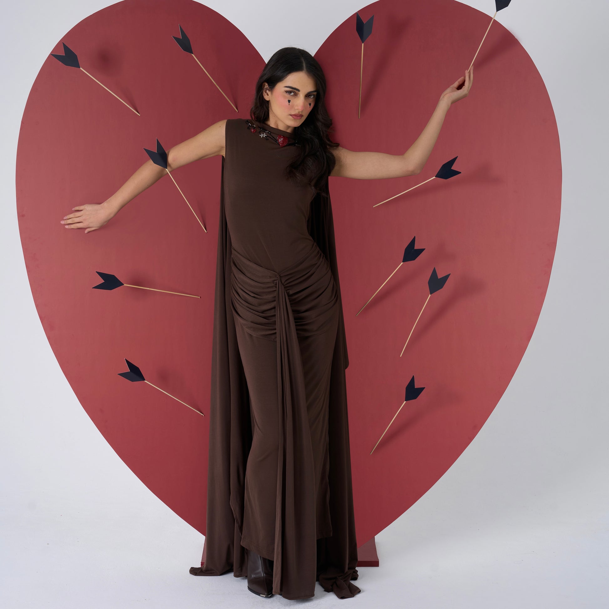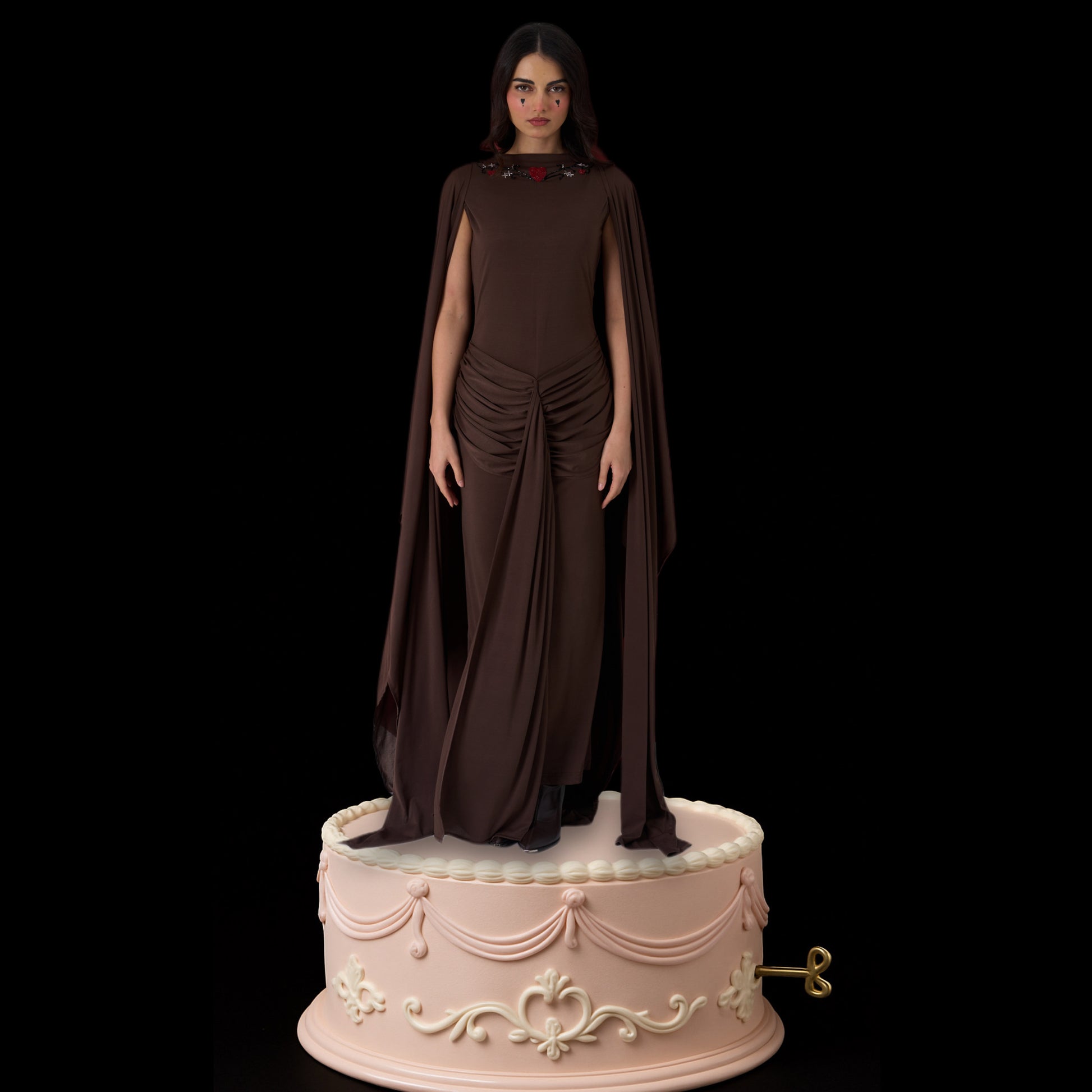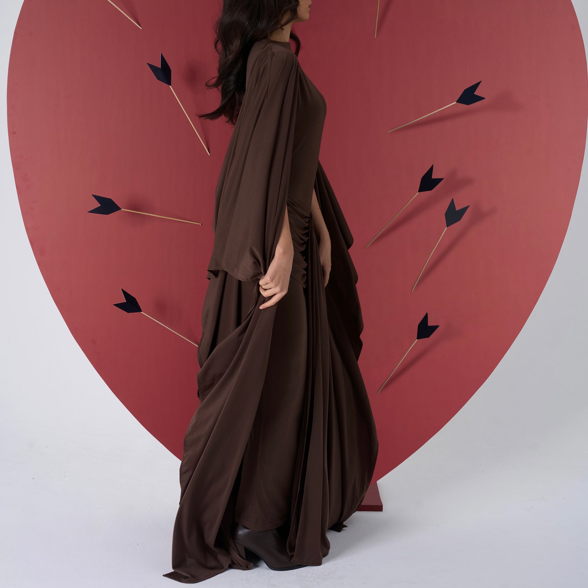A sculpting one piece gown designed with soft ruching and an attached flowing cape that moves effortlessly with the body. Cut to contour while remaining fluid, it balances quiet strength with refined elegance.