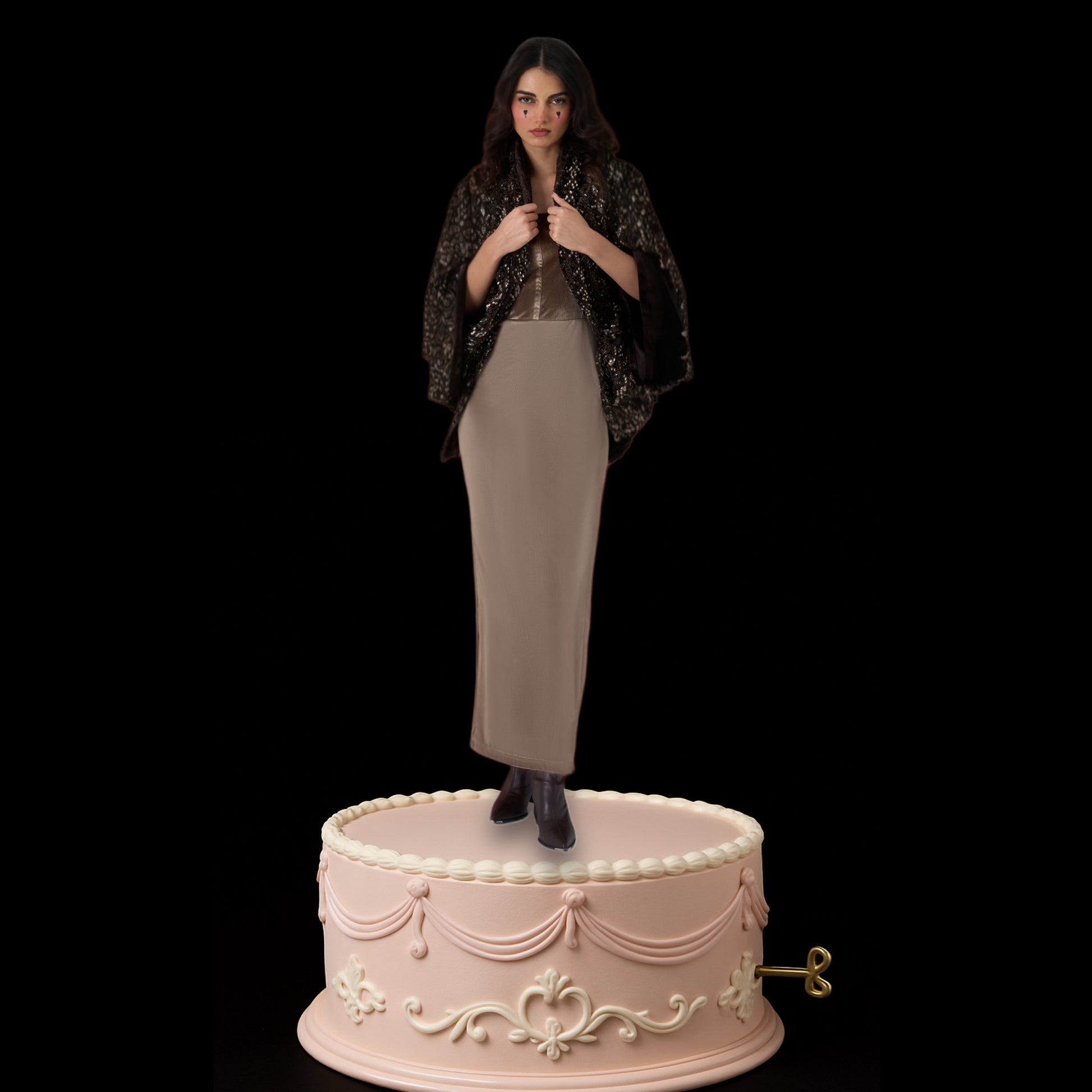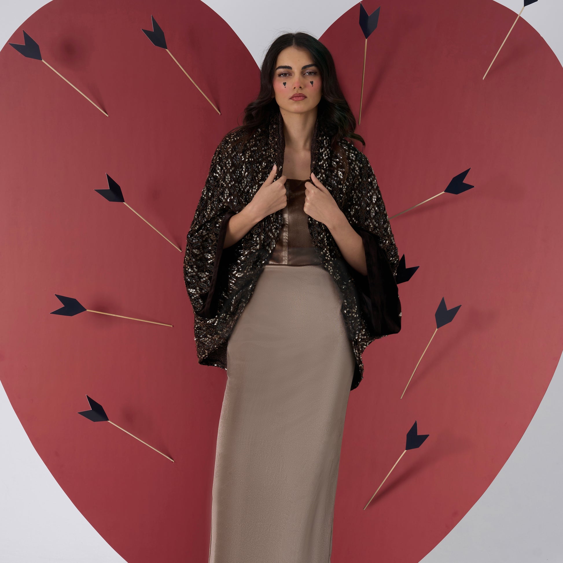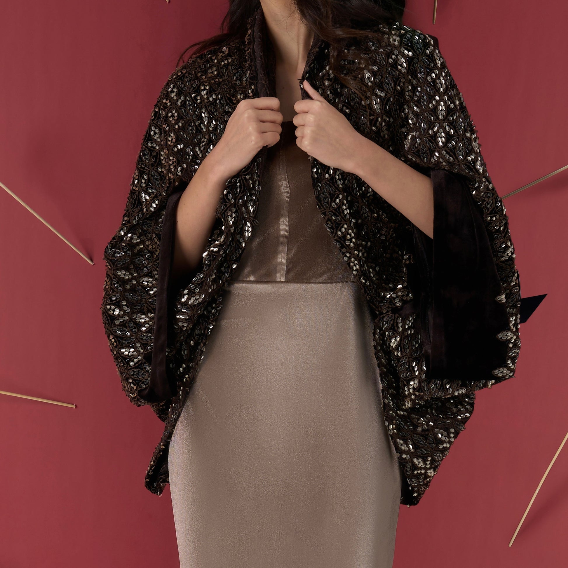 A fluid dress paired with a sequin-detailed jacket. Designed for understated elegance.