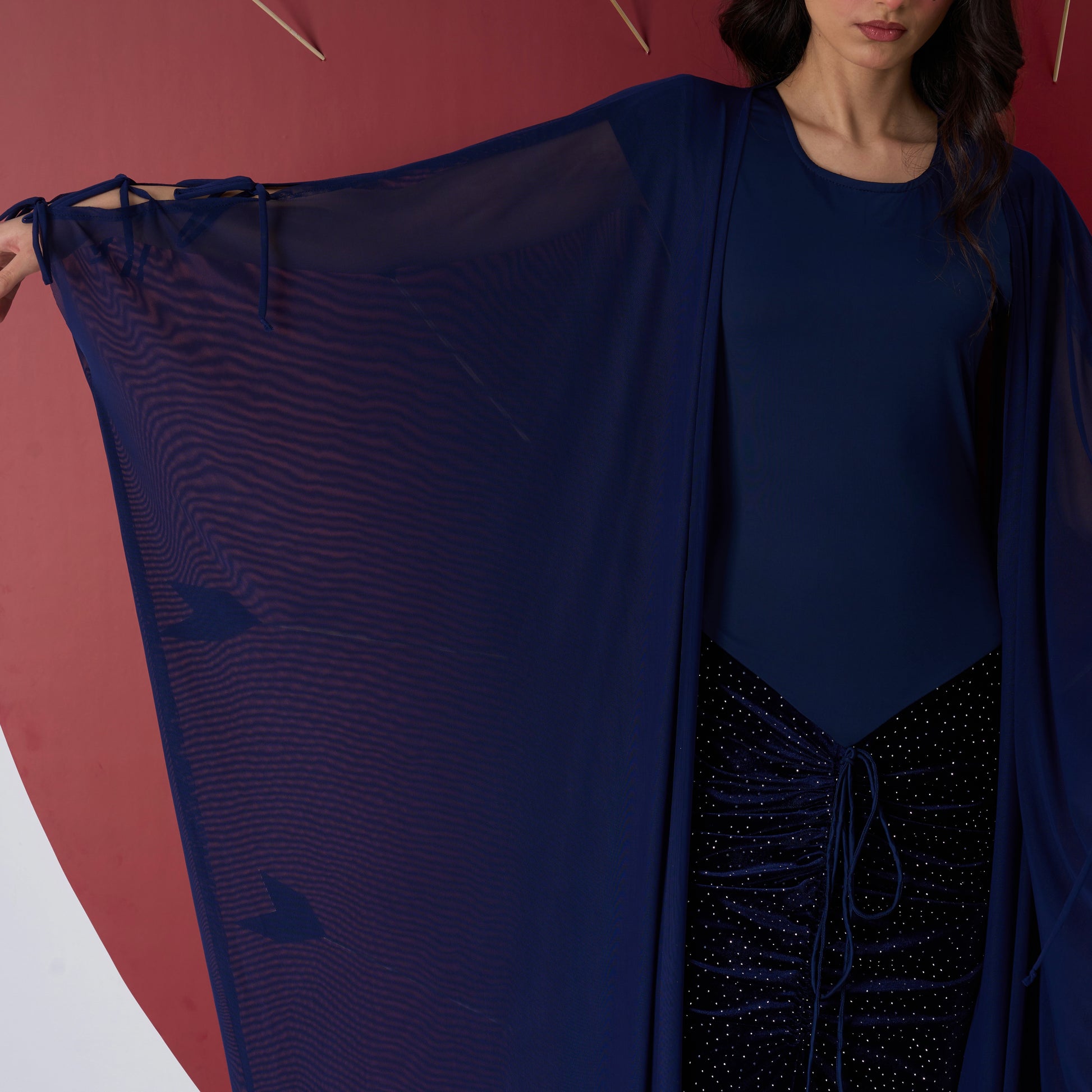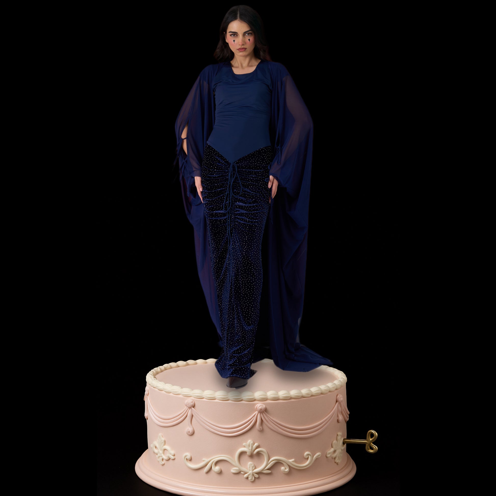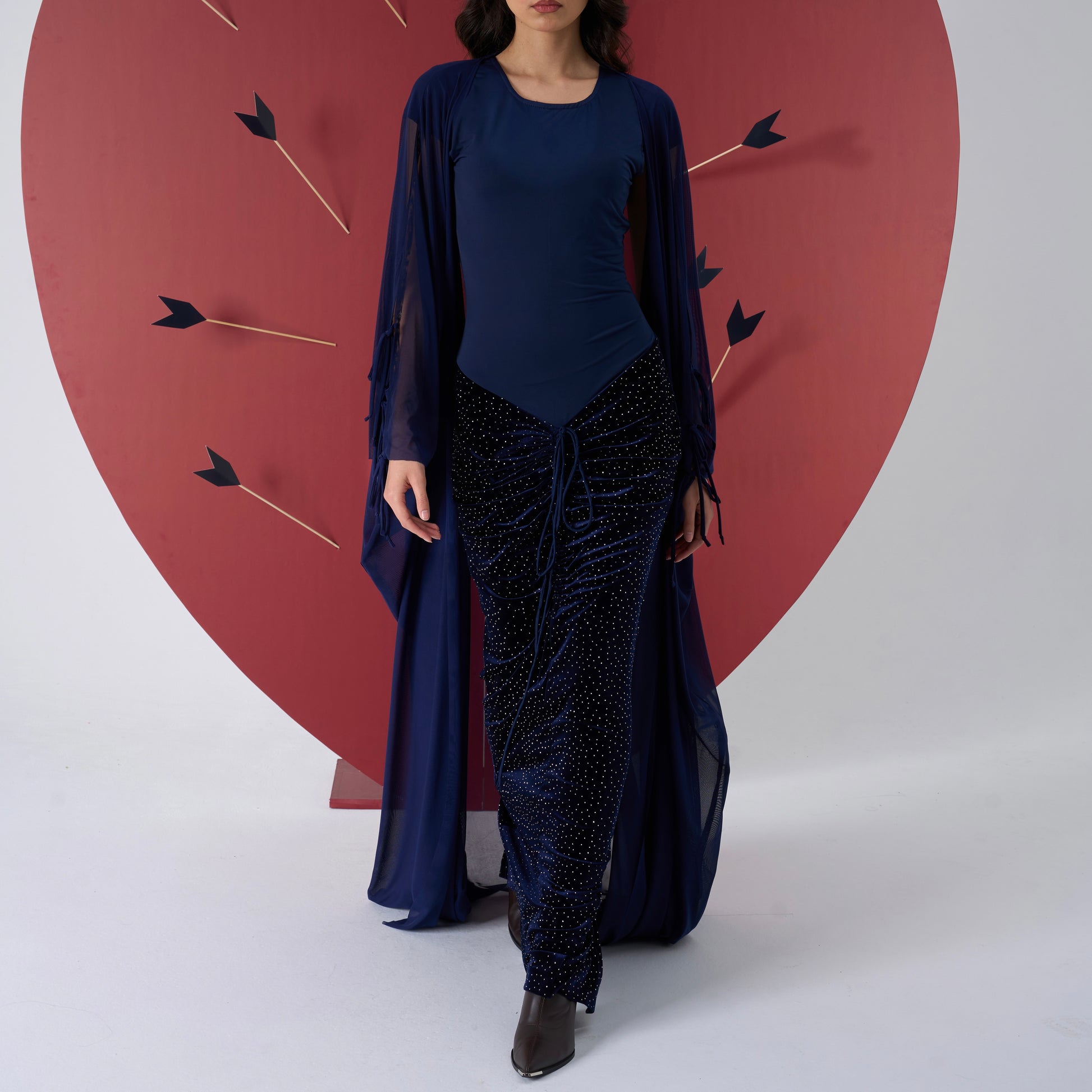 A fluid dress paired with a long sheer cover. Designed for movement, elegance, and quiet drama.
