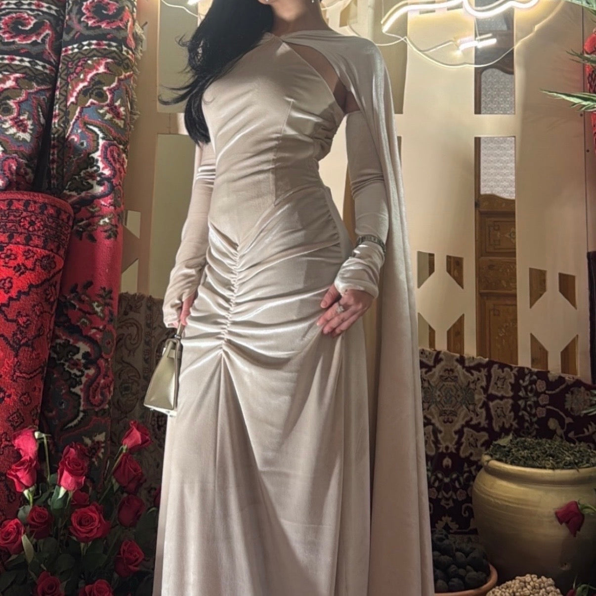 Complete your sophisticated look with our Valentine ensemble. The luxurious velvet daraa exudes elegance, while the gloves make a statement with their intricate detailing. Complete the outfit with the stunning cape, adding a touch of glamour to any occasion.