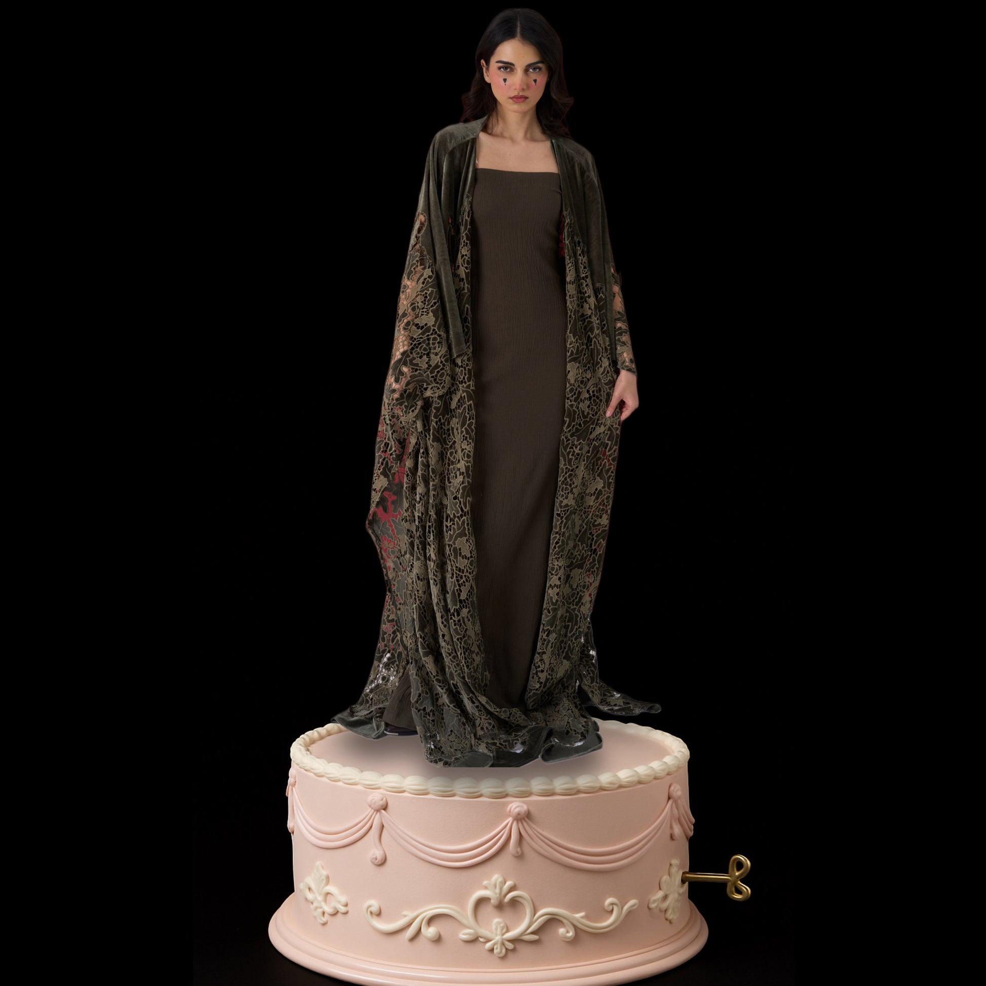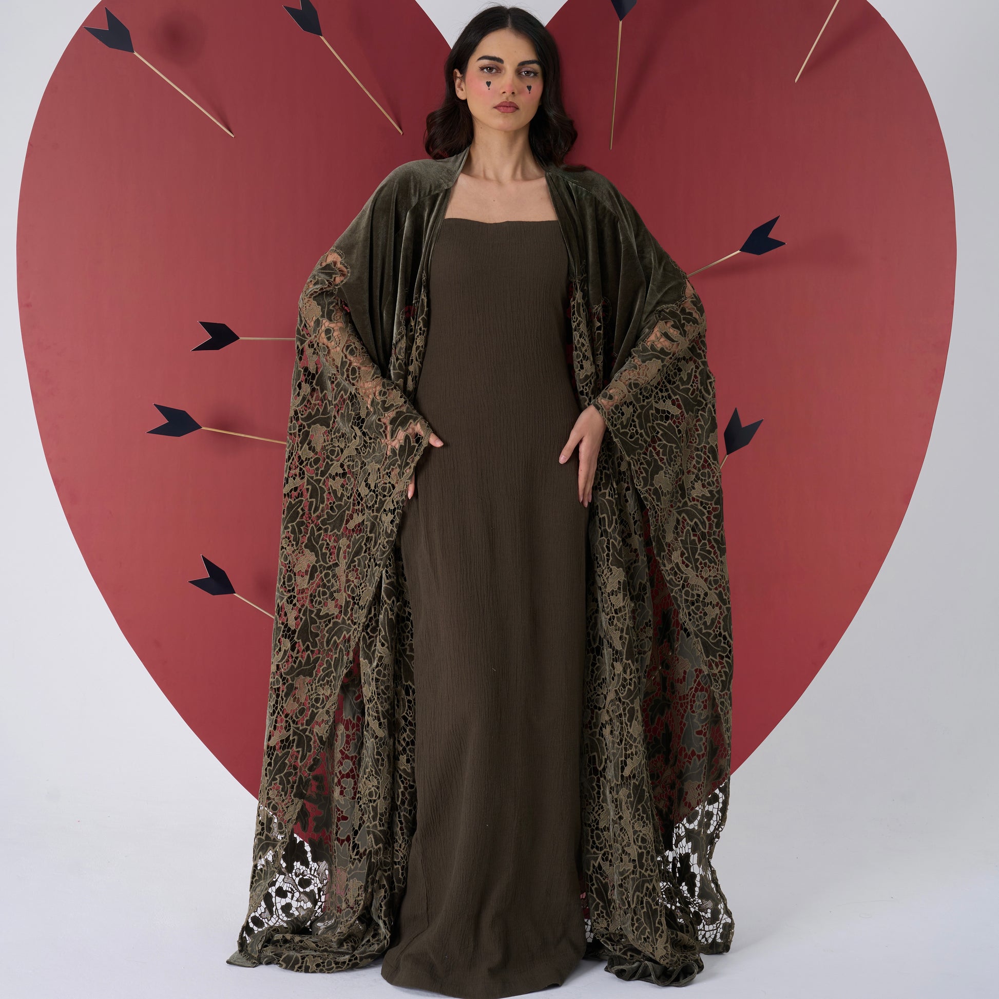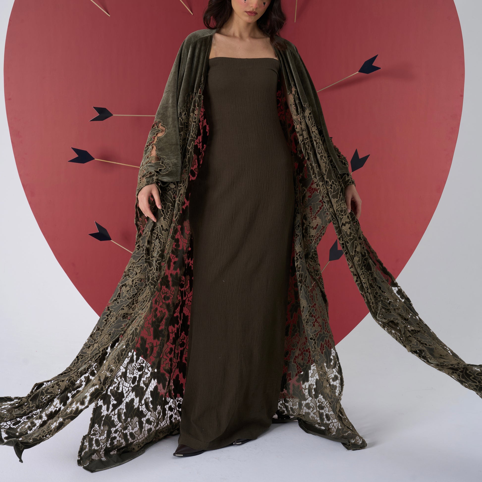 A fluid column gown paired with a lace-draped outer layer. Designed for effortless elegance and quiet strength.