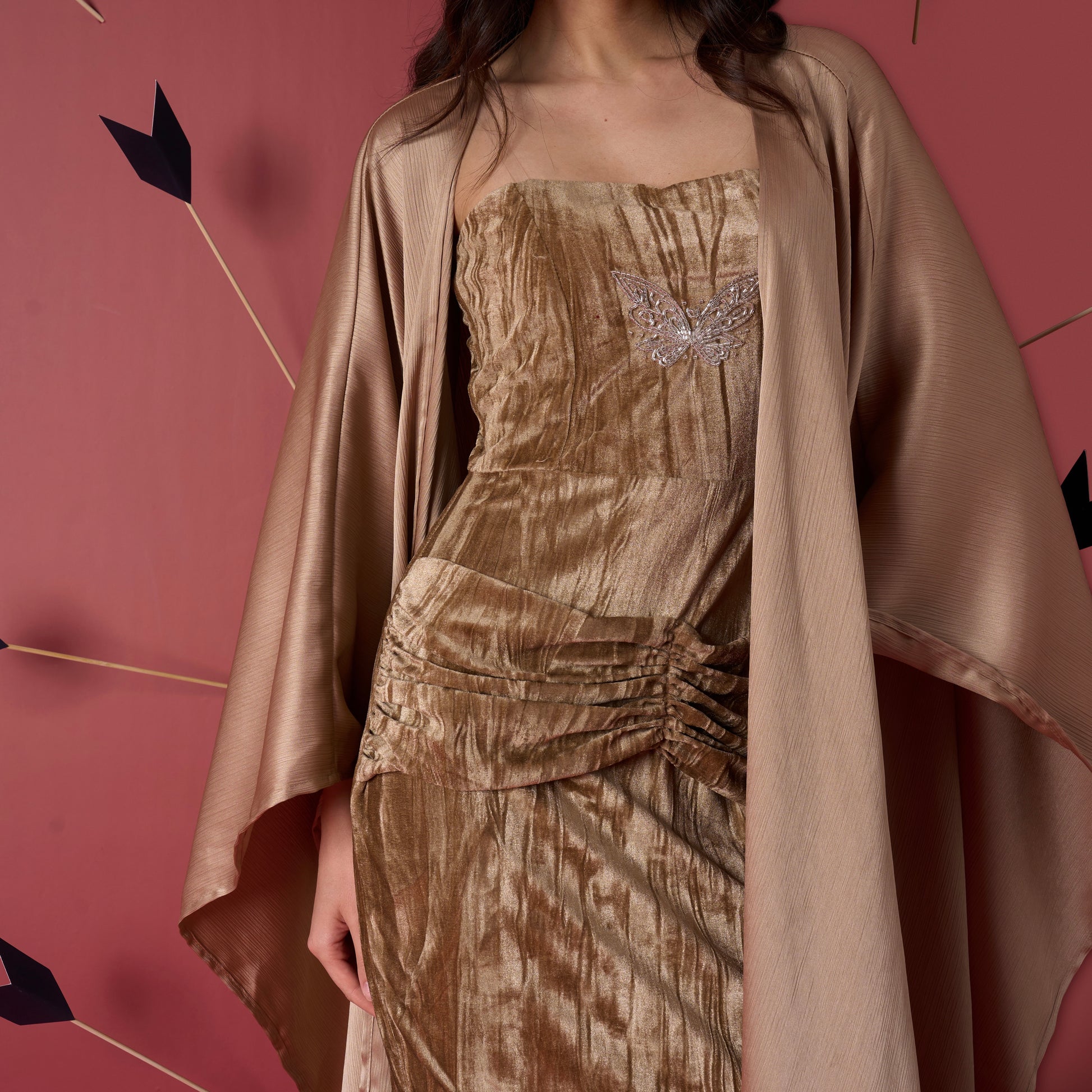 An elegant combination of texture and movement. The Velora Set features a flowing satin bisht layered over a softly folded velvet dress, designed for effortless sophistication.